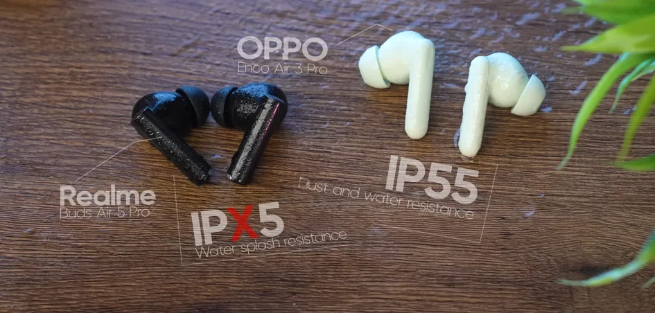 The OPPO Enco Air 3 Pro is the better choice. It has an IP55 rating, protecting it from both dust and water. The Realme only has an IPX5 rating, which handles sweat but offers no protection against dust or sand.